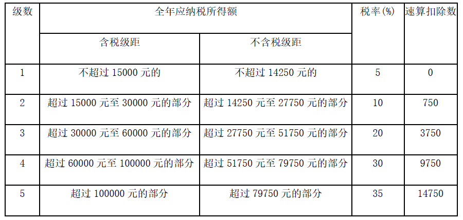 注:1、本表所列含税级距与不含税级距,均为按照税法规定以每一纳税年度的收入总额减除成本、费用以及损失后的所得额;2、含税级距适用于个体工商户的生产、经营所得和由纳税人负担税款的对企事业单位的承包经营、承租经营所得;不含税级距适用于由他人(单位)代付税款的对企事业单位的承包经营、承租经营所得。