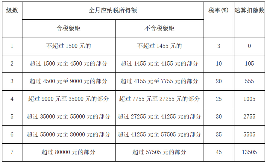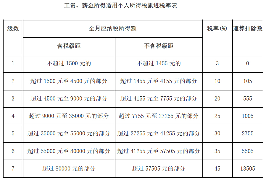 注:1、本表所列含税级距与不含税级距,均为按照税法规定减除有关费用后的所得额2、含税级距适用于由纳税人负担税款的工资、薪金所得;不含税级距适用于由他人(单位)代付税款的工资、薪金所得。