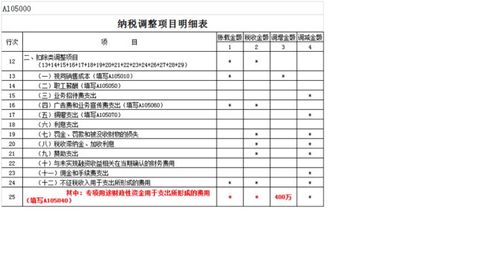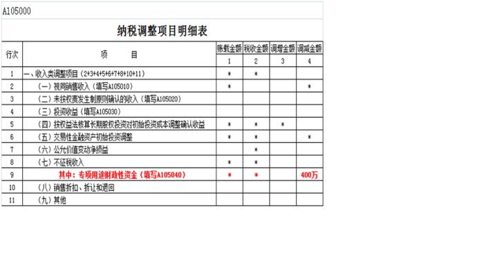 在第5行第11列(费用化支出金额)填报400万,同时做纳税调增处理。第11列"其中:费用化支出金额":填报纳税人历年作为不征税收入处理的符合条件的财政性资金,在本年(申报年度)用于支出计入本年损益的费用金额,本列第7行金额为《纳税调整项目明细表》(A105000)第25行"其中:专项用途财政性资金用于支出所形成的费用"的第3列"调增金额"。填写的纳税申报表如下所示: