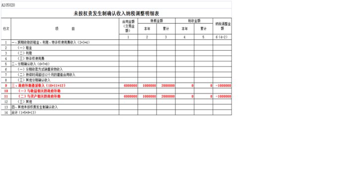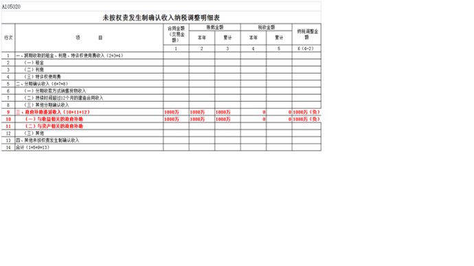 (2)2016年度的企业所得税汇算清缴时,需要纳税调减1000万元,必须在纳税申报表A105020(未按权责发生制原则确认的收入纳税调整表)第10行纳税调减1000万元,填好的申报表如下所示。