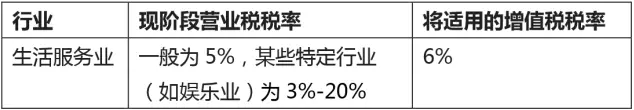 新增值税法规未对生活服务业提供任何过渡政策。从2016年5月1日起提供的应税服务将全部适用6%的增值税税率,无论该笔业务是否预期将在上述日期之前发生。