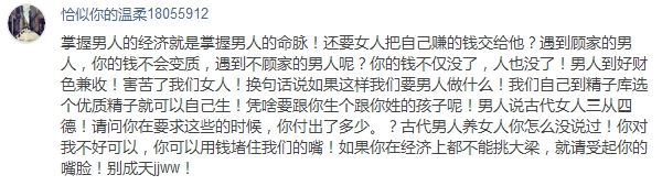 评论大概可以分为三派:第一,掌握钱就是掌握男人;第二,管自己花管自己吃;第三,家庭理财靠男人。