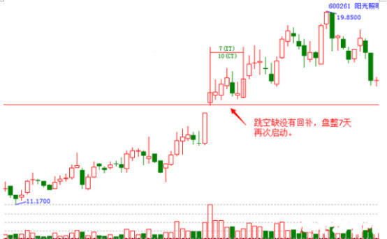 盘时时要求:小幅度盘整,阳线多阴线少为佳,不能有太长的上下影线。盘整次日成交量比大阳线量能大,随后的量能持平或萎缩。且盘整时间不能超过13天。