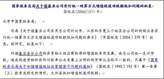 这种情况实际还有总局文件做支撑。但是,这里,大家回过头来看总局06年答复北京国税这个文件,他表达的并不是这个意思:即诺基亚这种分公司采购,总公司付款实际上不符合192号文的三流一致规定,不能抵扣进项税。但你们北京国税打报告给我了,我考察了一下,觉得诺基亚这种公司管理规范,这种总、分付款有一定合理性,因此特批诺基亚这种情况不属于192文不能抵扣进项税情况。但是,这个文件我只是下发给诺基亚,其他公司出现类似情况能否适用则不一定。