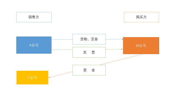 这里,A公司销售货物、劳务给M公司,专票开给M公司。但由于C公司欠M公司钱,或者M公司暂时没有钱,M公司委托C公司将款项支付给A公司,然后M公司和C公司之间再进行债权、债务关系的抵消。