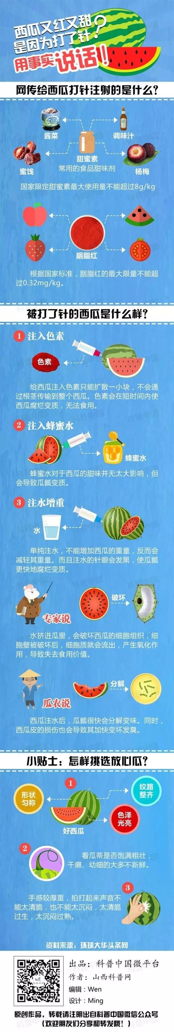 夏天来了,吃颗西瓜又解暑又营养。可是, 近期一条朋友圈传闻让很多人犯了怵:有些西瓜看上去又红又甜,是因为它被注射了色素和甜味剂。