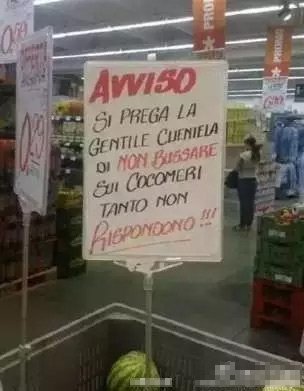 日前,有用户在微博上称,意大利的一家超市立了一个牌子:"尊敬的顾客,请您不要再敲西瓜了,它们是真的不会回应的!!!"。不过意大利超市并没有特别说明针对哪国人,但由此也引发了中国人购买西瓜时讨论习惯的热情,不敲西瓜那怎么买?