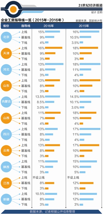 2016年,北京、天津、河北、山东、内蒙古、山西、云南、四川、陕西、江西和新疆等11地公布的当年企业工资指导线中,绝大多数省区市进行了下调。