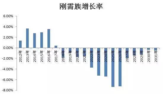 我们把买房刚需族定义为25岁到35岁的人口。根据出生人口估算刚需族人口,不考虑死亡因素,则各年刚需族增长率如下:
