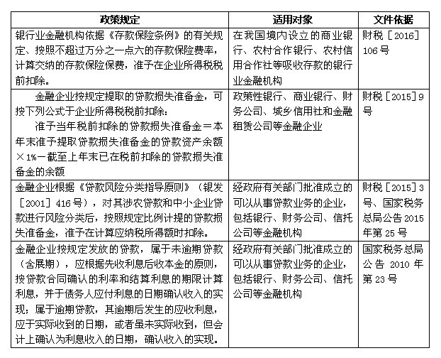 目前,金融企业在企业所得税准备金扣除、费用扣除、利息收入确认等方面适用的特定行业政策,汇总如下: