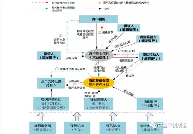 浦发银行作为信托计划的委托人将15亿元委托给大业信托设立单一资金信托(海印资金信托SPV1),向海印股份发放信托贷款,浦发银行作为信托受益人拥有信托受益权,海印股份则以旗下运营管理的14家商业物业整租合同项下的商业物业特定期间经营收益权应收账款质押给海印资金信托,并承诺以14家商业物业的租金及其他收入作为信托贷款的还款来源。