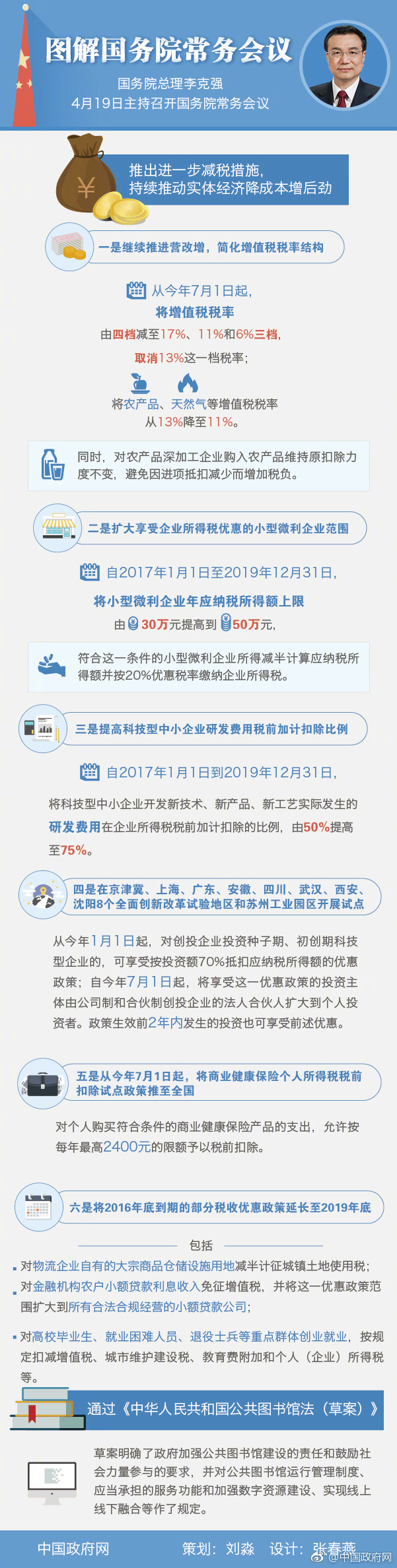 国务院总理李克强4月19日主持召开国务院常务会议,决定推出进一步减税措施,持续推动实体经济降成本增后劲。