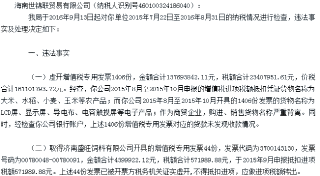 2016年9月13日起稽查局就开始查案,最终查到虚开增值税专用发票1406份,金额合计137693842.11元,税额合计23407951.61元,价税合计161101793.72元。