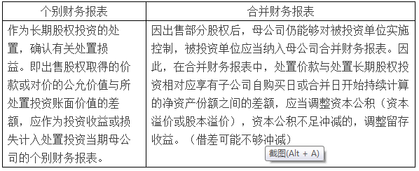 企业持有对子公司投资后,如对子公司部分股权出售,但出售后仍然保留对被投资单位的控制权,被投资单位仍然为其子公司的情况下,在母公司个别财务报表中应按出售股权取得的价款或对价的公允价值与所处置投资账面价值的差额,计入处置当期的投资收益或投资损失;但在合并财务报表中,应按处置长期股权投资取得的价款或对价的公允价值与处置长期股权投资相对应享有子公司净资产的差额,计入资本公积(股本溢价),资本公积(股本溢价)的余额不足中减的,应当调整留存收益。