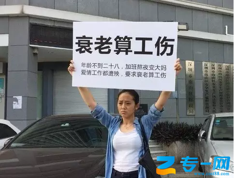 一名25岁的女子因长时间熬夜加班、用脑过度、压力过大等,让容颜衰老,导致爱情与事业双失意,于是到深圳市南山区劳动大厦举牌,纸牌上写道:"年龄不到二十八加班熬夜变大妈,爱情工作都遭殃要求衰老算工伤。"