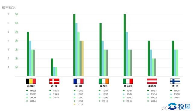 2012年,29个OECD成员国中,累进级次最少的是2级,累进级次最多的超过10级,平均累进级次为5.4级。29个OECD成员国中,累进级次保持不变的国家有12个,累进级次增加的国家有9个,累进级次减少的国家有4个。变动的结果,导致平均税率累进级次出现增加的势头,2012年比2006年增加了0.34级。