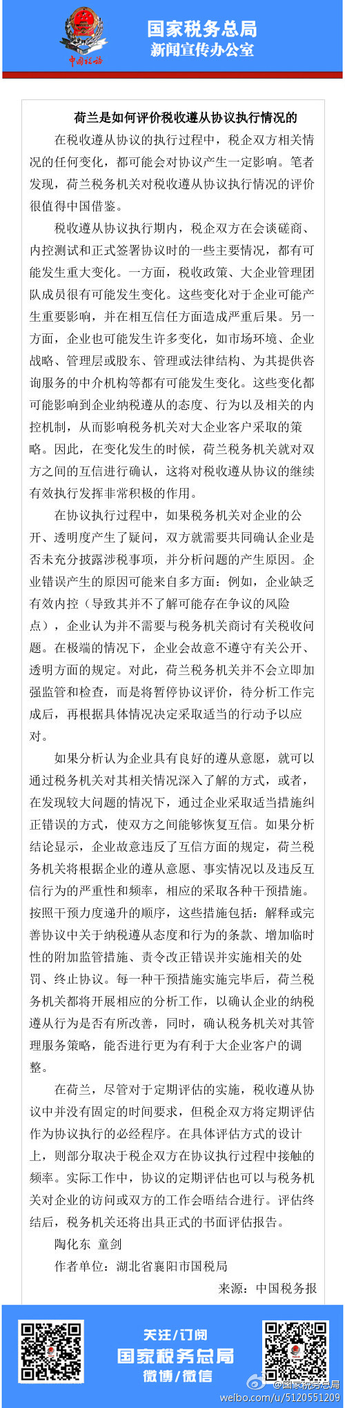 在税收遵从协议执行过程中,税企双方相关情况任何变化,都可能对协议产生一定影响。在荷兰,税企双方将定期评估作为协议执行必经程序。评估终结后将出具书面报告。荷兰税务机关对税收遵从协议执行情况的评价值得中国借鉴。