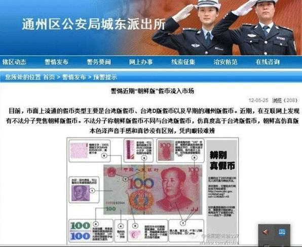 2012年,5月份通州区公安局就曾在其官网发布消息称:近期,在互联网上发现有不法分子兜售朝鲜假币。其中还提到,朝鲜假币高仿版本色泽声音手感和真钞没有区别!