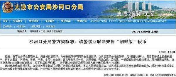 而在2010年12月,大连市沙河口分局也曾发布消息:请警惕互联网兜售"朝鲜版"假币。