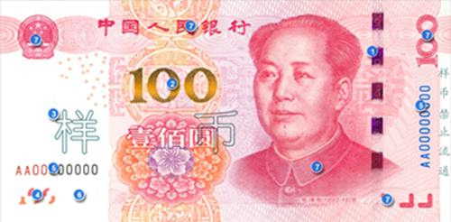 票面正面毛泽东头像、国徽、"中国人民银行"行名、右上角数字、盲文及背面人民大会堂等均采用雕刻凹印印刷,用手指触摸有明显的凹凸感。