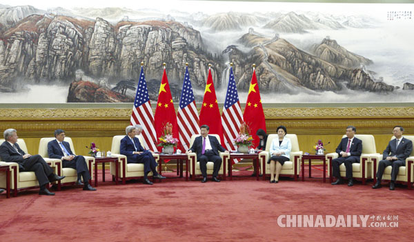 6月7日,国家主席习近平在北京人民大会堂会见来华出席第八轮中美战略与经济对话和第七轮中美人文交流高层磋商的美国国务卿克里、财政部长雅各布·卢。(图片来源:新华社)