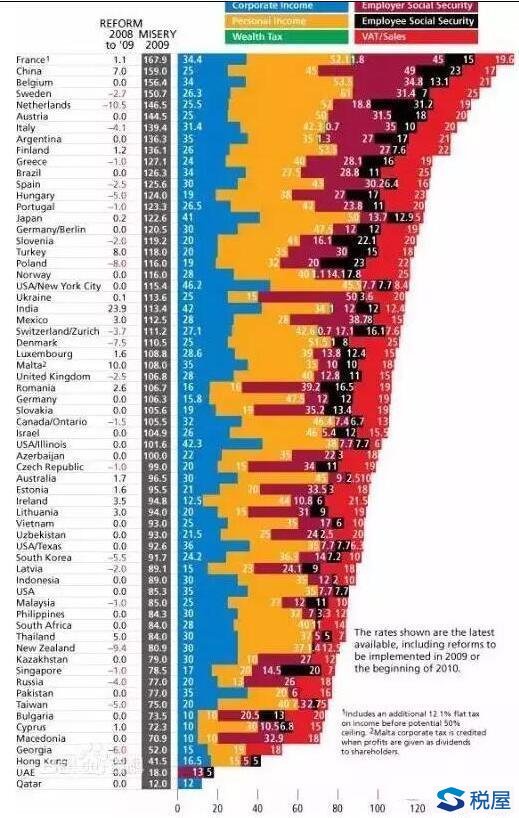 如果放在全球加上其他税负来看的话,排名第一的法国尽管是痛苦指数第一,但是他们的国民福利超好。