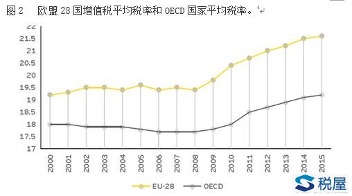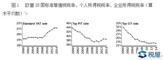 促成这种持续的发展的另外一个重要原因在于,在国际税收竞争和经济疲软的背景下,根本不允许征收越来越多的企业或个人所得税。间接税,根据定义是由消费者承担,不依赖于利润,受经济形势影响有限。在这样的背景下,最近的一个研究结果非常惊人:欧盟28个成员国家,他们增加增值税税率的同时,以同样的速度减少企业和个人所得税税率(见图1)。在实践中,我们可以看到间接税主要以三种方式带来更多的收入:
