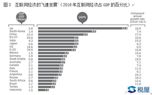 在过去的几年中,电子商务在许多国家都是发展最快的。2016年,在20国集团中互联网经济将占到GDP的5.3%(见表3)。