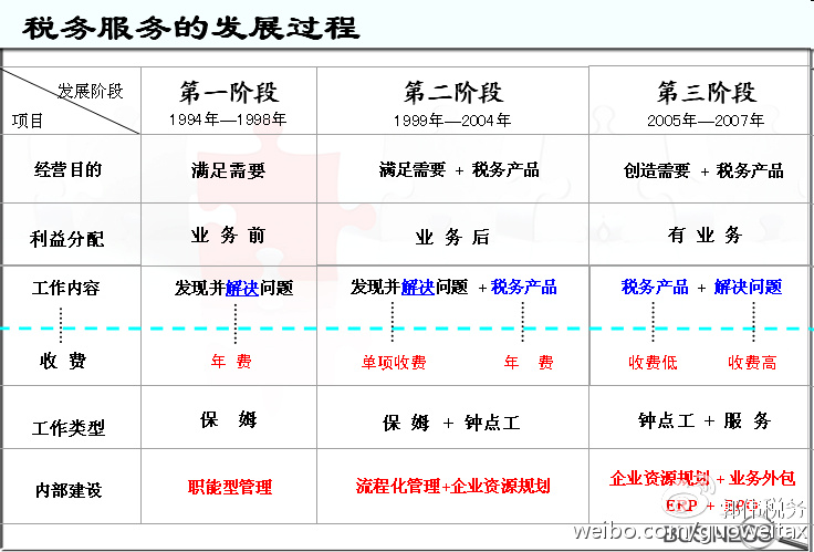 以下文章,是我写于2008年4月,重新发布的目的,是希望那些准备转型的涉税服务机构和人员,先了解观念上的差异,再思考自己的特点,确定好转型的路径和时间表,开始行动吧。