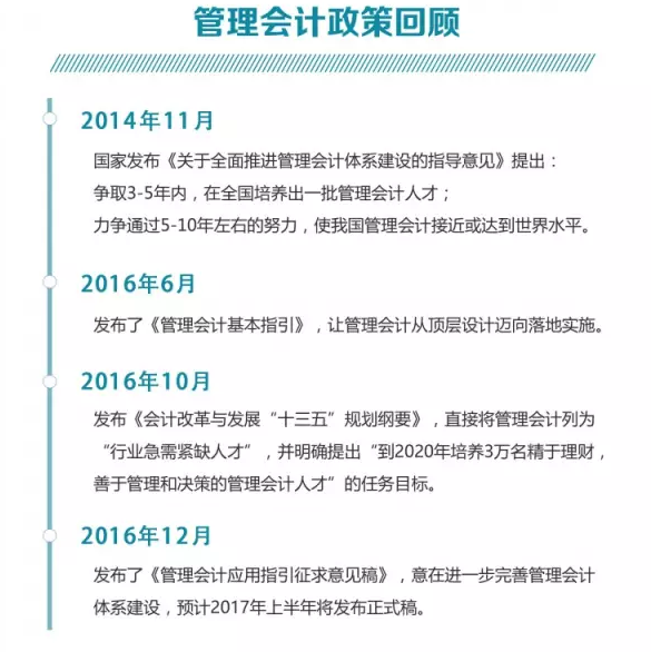 16年10月,我国会计权威机构发布《会计改革与发展"十三五"规划纲要》,直接将管理会计列为"????????行业急需紧缺人才",并明确提出"到2020年培养3万名精于理财,善于管理和决策的管理会计人才"的任务目标。