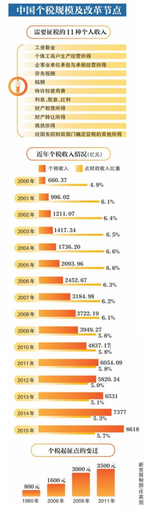 关于个税改革,人们最先想到的问题就是起征点,在前几次个税改革中,提高起征点都成为主要的改革内容。截至目前,个税起征点在2006年、2008年和2011年提高过三次,由800元一路调高至3500元。因此,个税起征点是否迎来第四次调高就备受关注。