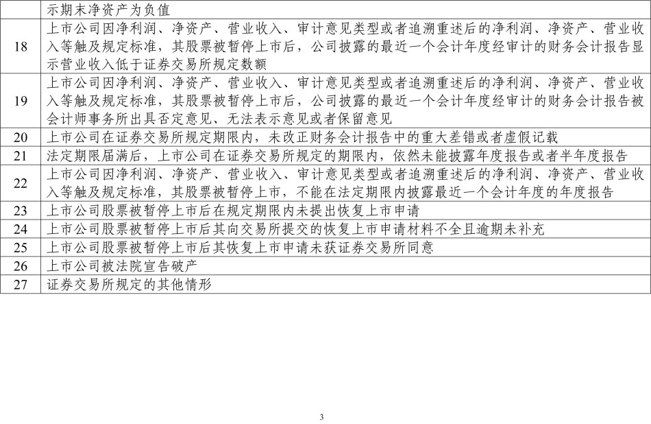 上市公司因净利润、净资产、营业收入、审计意见类型或者追溯重述后的净利润、净资产、营业收入等触及规定标准,其股票被暂停上市交易后,公司披露的最近一个会计年度经审计的财务会计报告存在扣除非经常性损益前后的净利润孰低者为负值、期末净资产为负值、营业收入低于证券交易所规定数额或者被会计师事务所出具保留意见、无法表示意见、否定意见的审计报告等情形之一的,证券交易所应当终止其股票上市交易。