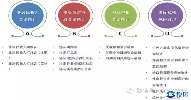 非居民企业收入查询统计、享受协定待遇查询统计和关联申报情况查询统计主要以查询、汇总功能为主。国际税收风险管理模块主要是将国际税收各类风险指标汇总,形成风险指标库,固化在信息平台中,以实现对国际税收风险实时监控的目的。