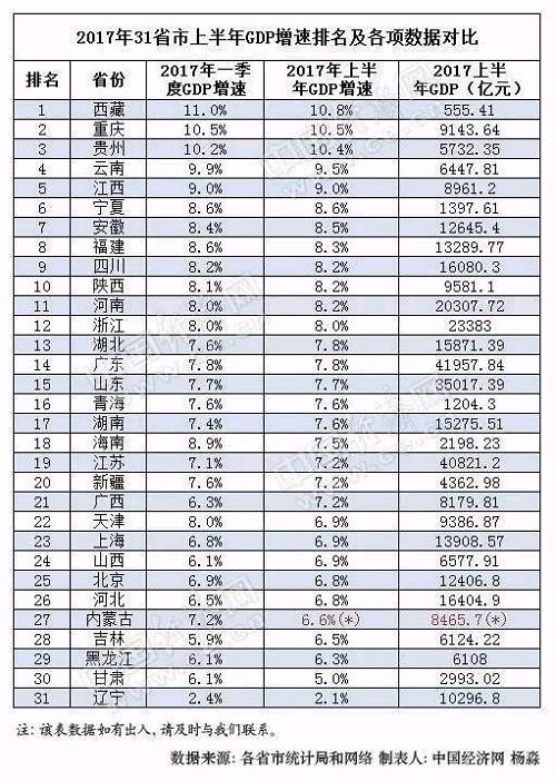 从表中可以看到,与一季度GDP增速相比,全国31个省市中有西藏、云南、福建、海南、新疆、天津、北京、内蒙古、甘肃、辽宁10地上半年GDP增速有所回落。重庆、江西、宁夏、四川、浙江、广东、山东、青海8地的GDP增速与一季度持平。其它13个省份的GDP增速较一季度有所增长。