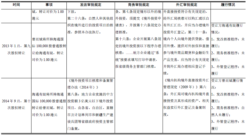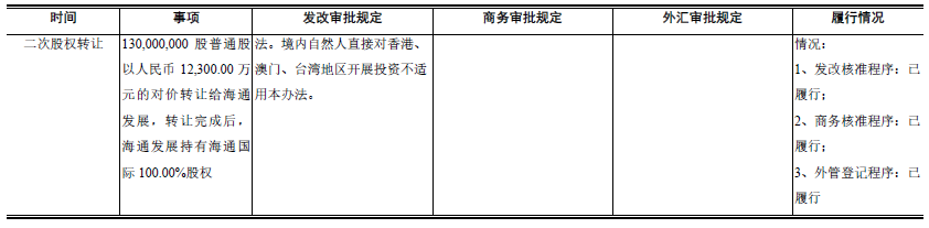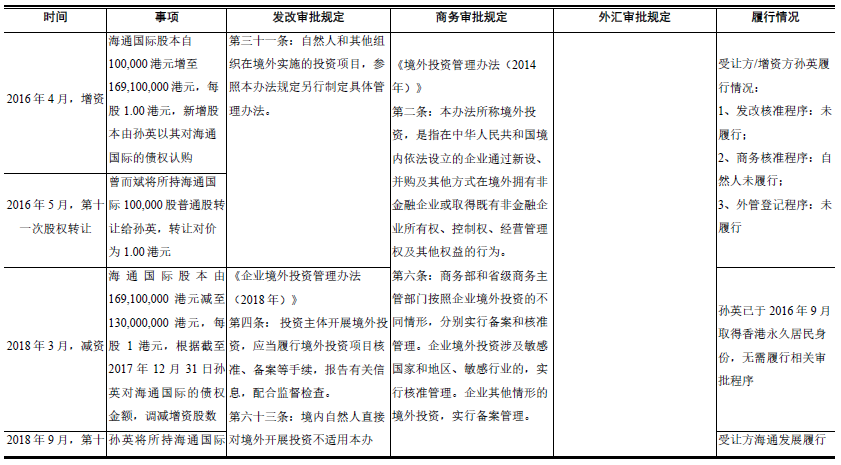 ① 发行人已于2018年收购海通国际100%股权时完整履行相关部门核准备案程序根据发行人提供的资料及说明,发行人已向相关部门说明历史瑕疵,并于2018年收购海通国际100.00%股权时,完整履行发改备案、商务核准、外汇登记等程序。