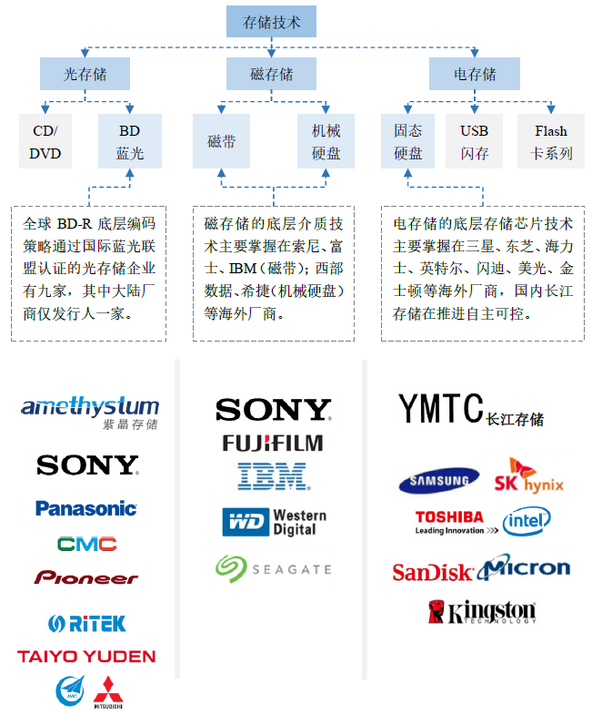 底层物理存储介质有 光、磁、电三种 ,对应的用于企业级存储市场主要产品类型有蓝光光盘 、磁带、机械硬盘、固态硬盘,技术格局如下所示: